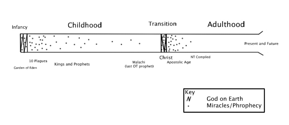 Some versions use “tutor” or “schoolmaster” here instead of guardian. This carries the concept of teaching or learning. Indeed, Paul says he wouldn’t have known sin unless the law had taught him. The more and more I read the bible, the more I see the history of God’s people as a maturing person, and this is simply amazing. I have a picture that I sketched out to show you what I mean.